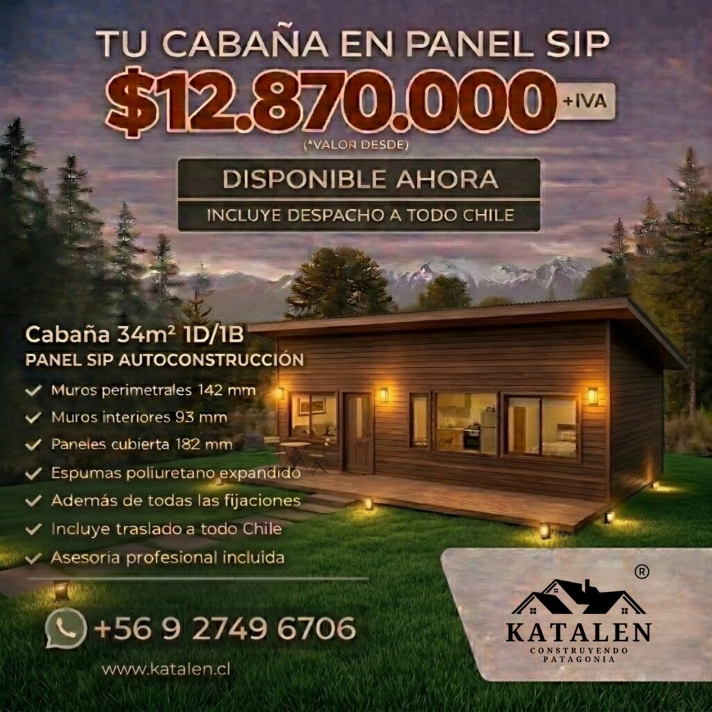 Descubre una solución habitacional más amplia, cómoda y pensada para disfrutar plenamente el entorno natural del sur de Chile con esta cabaña en Panel SIP de 34 m², diseñada para quienes buscan mayor espacio sin perder eficiencia, calidad y diseño contemporáneo. Este modelo de 1 dormitorio y 1 baño ofrece una distribución funcional, ideal tanto para vivienda permanente como para segunda residencia en la Patagonia.
