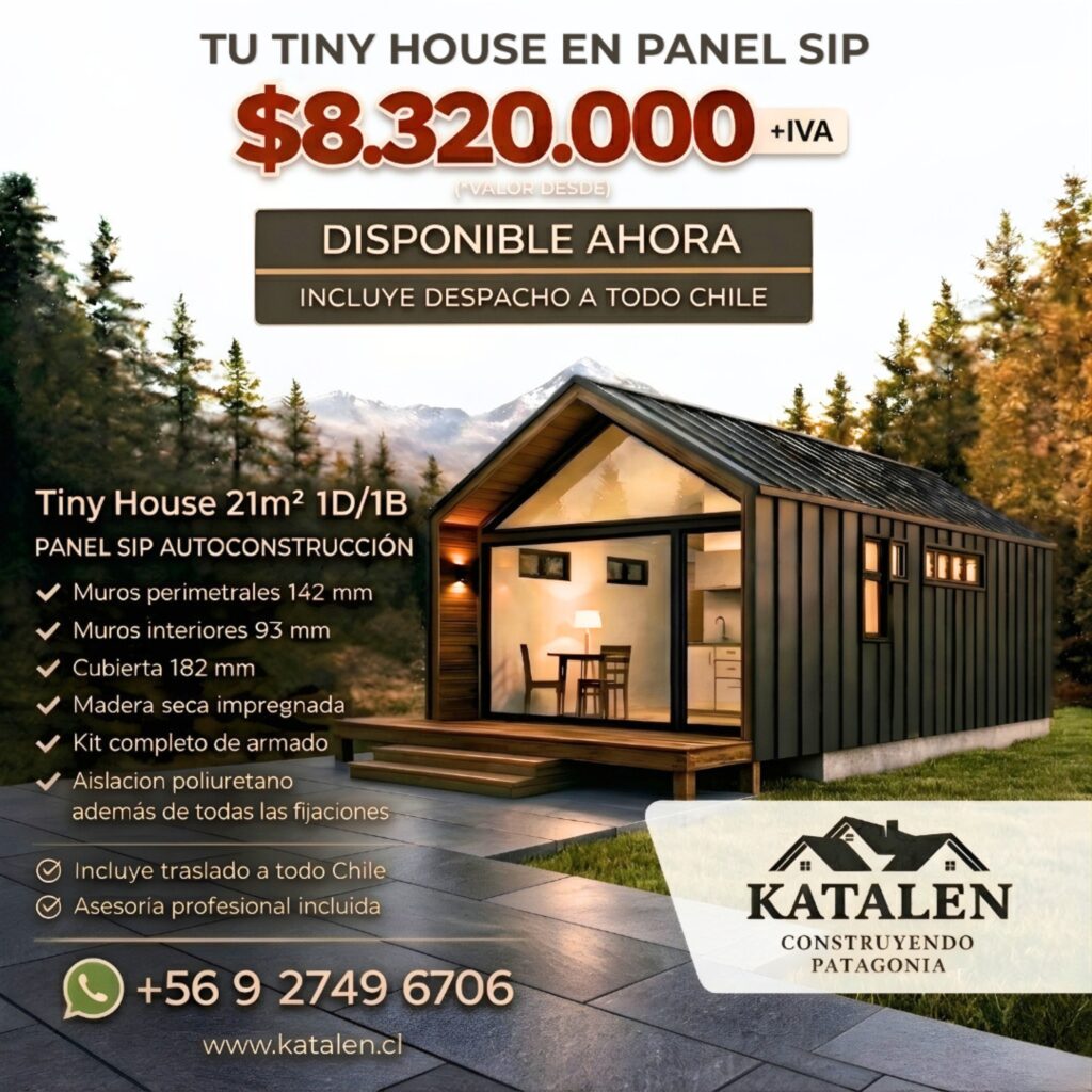 Descubre una nueva forma de habitar el sur de Chile con esta Tiny House en Panel SIP de 21 m², diseñada para quienes buscan eficiencia, confort y un estilo de vida moderno en armonía con la naturaleza. Este modelo de 1 dormitorio y 1 baño combina un diseño contemporáneo con tecnología constructiva de alto estándar, ideal para la región de Aysén y todo el territorio nacional.